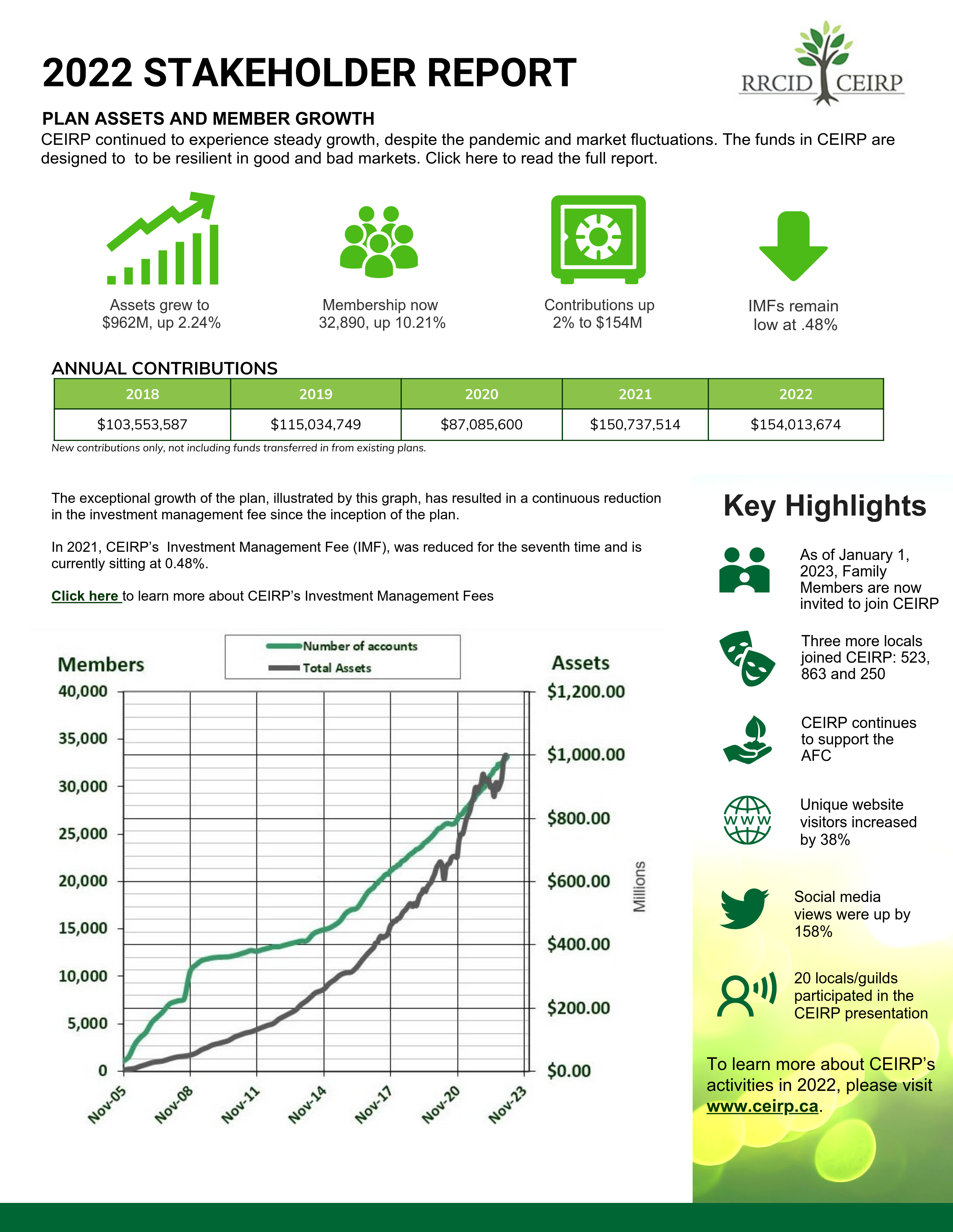Annual Administrators Meeting Once again, due to the pandemic, the annual meeting was held virtually on November 24. CEIRP administrators from across the country were updated on new developments introduced by Canada Life. One important change was the ability of plan members to now manage their accounts online, thereby bypassing the Canada Life call centre if they preferred. In 2023, the next plan administrators annual meeting is scheduled to be in person.